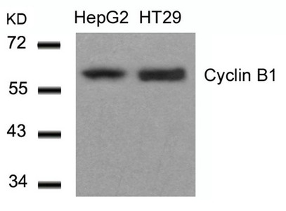 Western blot analysis of extracts from HepG2 and HT29 cells using Cyclin B1(Ab-147) Antibody.