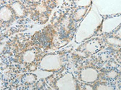The image on the left is immunohistochemistry of paraffin-embedded Human thyroid cancer tissue using CSB-PA446984(CCND1 Antibody) at dilution 1/50, on the right is treated with fusion protein. (Original magnification: ×200)
