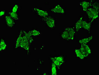 Immunofluorescent analysis of HepG2 cells using CSB-PA004812LA01HU at dilution of 1:100 and Alexa Fluor 488-congugated AffiniPure Goat Anti-Rabbit IgG(H+L)
