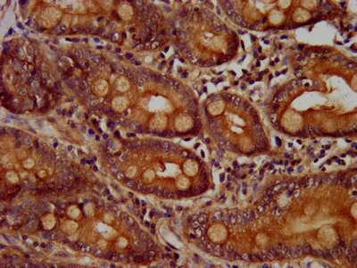 • IHC image of CSB-PA004854LA01HU diluted at 1:400 and staining in paraffin-embedded human small intestine tissue performed on a Leica BondTM system. After dewaxing and hydration, antigen retrieval was mediated by high pressure in a citrate buffer (pH 6.0). Section was blocked with 10% normal goat serum 30min at RT. Then primary antibody (1% BSA) was incubated at 4°C overnight. The primary is detected by a biotinylated secondary antibody and visualized using an HRP conjugated SP system.