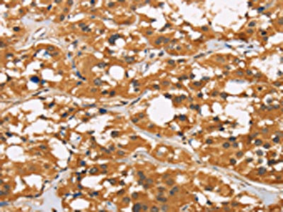 The image on the left is immunohistochemistry of paraffin-embedded Human thyroid cancer tissue using CSB-PA616669(CD22 Antibody) at dilution 1/50, on the right is treated with fusion protein. (Original magnification: ×200)
