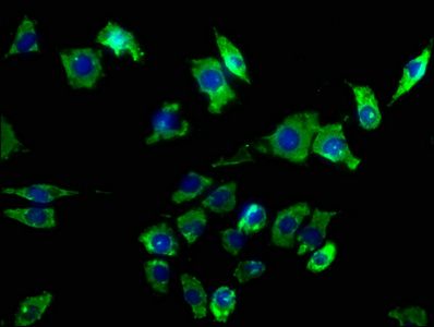 Immunofluorescence staining of SH-SY5Y cells with CSB-PA10468A0Rb at 1:50, counter-stained with DAPI. The cells were fixed in 4% formaldehyde, permeabilized using 0.2% Triton X-100 and blocked in 10% normal Goat Serum. The cells were then incubated with the antibody overnight at 4°C. The secondary antibody was Alexa Fluor 488-congugated AffiniPure Goat Anti-Rabbit IgG(H+L).