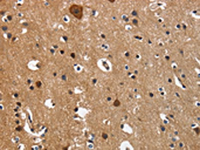 The image on the left is immunohistochemistry of paraffin-embedded Human brain tissue using CSB-PA149291(CD27 Antibody) at dilution 1/60, on the right is treated with fusion protein. (Original magnification: ×200)