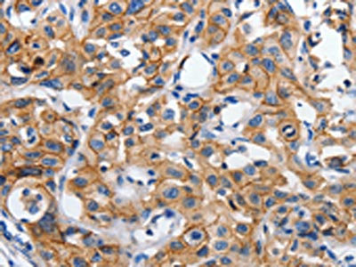 • The image on the left is immunohistochemistry of paraffin-embedded Human cervical cancer tissue using CSB-PA218378(CDH1 Antibody) at dilution 1/100, on the right is treated with synthetic peptide. (Original magnification: ×200)