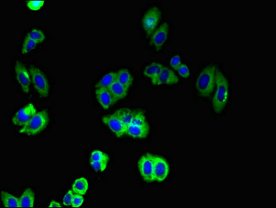 • Immunofluorescent analysis of HepG2 cells using CSB-PA005045LA01HU at dilution of 1:100 and Alexa Fluor 488-congugated AffiniPure Goat Anti-Rabbit IgG(H+L)