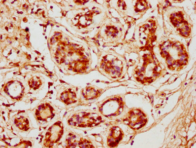 IHC image of CSB-PA005064LA01HU diluted at 1:600 and staining in paraffin-embedded human breast cancer performed on a Leica BondTM system. After dewaxing and hydration, antigen retrieval was mediated by high pressure in a citrate buffer (pH 6.0). Section was blocked with 10% normal goat serum 30min at RT. Then primary antibody (1% BSA) was incubated at 4°C overnight. The primary is detected by a biotinylated secondary antibody and visualized using an HRP conjugated SP system.