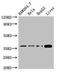 Positive WB detected in: RAW264.7 whole cell lysate, Hela whole cell lysate, HepG2 whole cell lysate, Mouse liver tissue