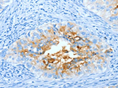 The image on the left is immunohistochemistry of paraffin-embedded Human cervical cancer tissue using CSB-PA229032(CEACAM5 Antibody) at dilution 1/20, on the right is treated with fusion protein. (Original magnification: ×200)