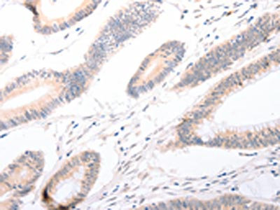 The image on the left is immunohistochemistry of paraffin-embedded Human colon cancer tissue using CSB-PA112790(CELSR2 Antibody) at dilution 1/50, on the right is treated with synthetic peptide. (Original magnification: ×200)
