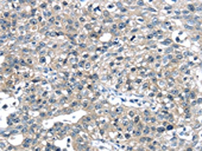 The image on the left is immunohistochemistry of paraffin-embedded Human breast cancer tissue using CSB-PA437170(CENPM Antibody) at dilution 1/20, on the right is treated with fusion protein. (Original magnification: ×200)