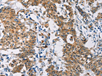 The image on the left is immunohistochemistry of paraffin-embedded Human gastric cancer tissue using CSB-PA898117(CERK Antibody) at dilution 1/30, on the right is treated with fusion protein. (Original magnification: ×200)