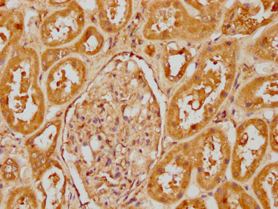 IHC image of CSB-PA13809A0Rb diluted at 1:400 and staining in paraffin-embedded human kidney tissue performed on a Leica BondTM system. After dewaxing and hydration, antigen retrieval was mediated by high pressure in a citrate buffer (pH 6.0). Section was blocked with 10% normal goat serum 30min at RT. Then primary antibody (1% BSA) was incubated at 4°C overnight. The primary is detected by a biotinylated secondary antibody and visualized using an HRP conjugated SP system.