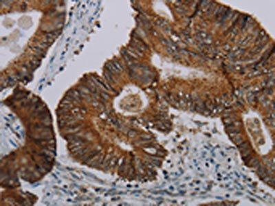 The image on the left is immunohistochemistry of paraffin-embedded Human colon cancer tissue using CSB-PA877207(CFLAR Antibody) at dilution 1/20, on the right is treated with synthetic peptide. (Original magnification: ×200)