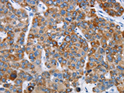 The image on the left is immunohistochemistry of paraffin-embedded Human liver cancer tissue using CSB-PA017354(CHDH Antibody) at dilution 1/20, on the right is treated with fusion protein. (Original magnification: ×200)