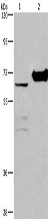 Gel: 10%SDS-PAGE, Lysate: 40 μg, Lane 1-2: 231 cells, mouse kidney tissue, Primary antibody: CSB-PA017354(CHDH Antibody) at dilution 1/400, Secondary antibody: Goat anti rabbit IgG at 1/8000 dilution, Exposure time: 20 seconds