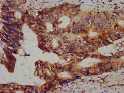 IHC image of CSB-PA878944LA01HU diluted at 1:800 and staining in paraffin-embedded human colon cancer performed on a Leica BondTM system. After dewaxing and hydration, antigen retrieval was mediated by high pressure in a citrate buffer (pH 6.0). Section was blocked with 10% normal goat serum 30min at RT. Then primary antibody (1% BSA) was incubated at 4°C overnight. The primary is detected by a biotinylated secondary antibody and visualized using an HRP conjugated SP system.