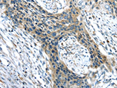 The image on the left is immunohistochemistry of paraffin-embedded Human esophagus cancer tissue using CSB-PA584727(CHRDL1 Antibody) at dilution 1/35, on the right is treated with synthetic peptide. (Original magnification: ×200)