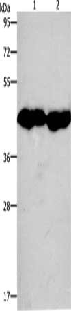 • Gel: 10%SDS-PAGE, Lysate: 50 μg, Lane 1-2: Mouse muscle tissue, Mouse Heart tissue, Primary antibody: CSB-PA561050(CKM Antibody) at dilution 1/950, Secondary antibody: Goat anti rabbit IgG at 1/8000 dilution, Exposure time: 2 seconds