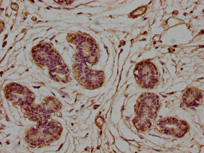 IHC image of CSB-PA005484LA01HU diluted at 1:100 and staining in paraffin-embedded human breast cancer performed on a Leica BondTM system. After dewaxing and hydration, antigen retrieval was mediated by high pressure in a citrate buffer (pH 6.0). Section was blocked with 10% normal goat serum 30min at RT. Then primary antibody (1% BSA) was incubated at 4°C overnight. The primary is detected by a biotinylated secondary antibody and visualized using an HRP conjugated SP system.