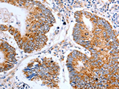 • The image on the left is immunohistochemistry of paraffin-embedded Human colon cancer tissue using CSB-PA228012(CLDN10 Antibody) at dilution 1/50, on the right is treated with synthetic peptide. (Original magnification: ×200)