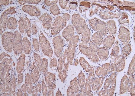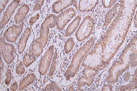 IHC image of CSB-PA005498ESR1HU diluted at 1:50 and staining in paraffin-embedded human stomach tissue performed on a Leica BondTM system. After dewaxing and hydration, antigen retrieval was mediated by high pressure in a citrate buffer (pH 6.0). Section was blocked with 10% normal goat serum 30min at RT. Then primary antibody (1% BSA) was incubated at 4°C overnight. The primary is detected by a Goat anti-rabbit polymer IgG labeled by HRP and visualized using 0.05% DAB.