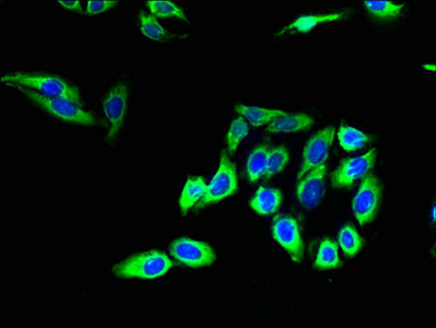 Immunofluorescent analysis of HepG2 cells using CSB-PA005501LA01HU at dilution of 1:100 and Alexa Fluor 488-congugated AffiniPure Goat Anti-Rabbit IgG(H+L)