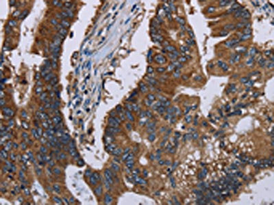 The image on the left is immunohistochemistry of paraffin-embedded Human colon cancer tissue using CSB-PA144936(CLDND1 Antibody) at dilution 1/40, on the right is treated with fusion protein. (Original magnification: ×200)