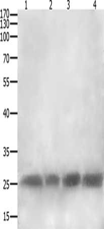 Gel: 12+15%SDS-PAGE, Lysate: 40 μg, Lane 1-4: RAW264.7, Hela cells, 823 cells, A549 cells, Primary antibody: CSB-PA016840(CLEC4A Antibody) at dilution 1/300, Secondary antibody: Goat anti rabbit IgG at 1/8000 dilution, Exposure time: 10 minutes