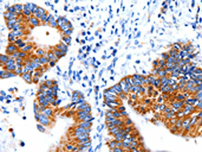 The image on the left is immunohistochemistry of paraffin-embedded Human colon cancer tissue using CSB-PA126836(CLEC7A Antibody) at dilution 1/5, on the right is treated with fusion protein. (Original magnification: ×200)