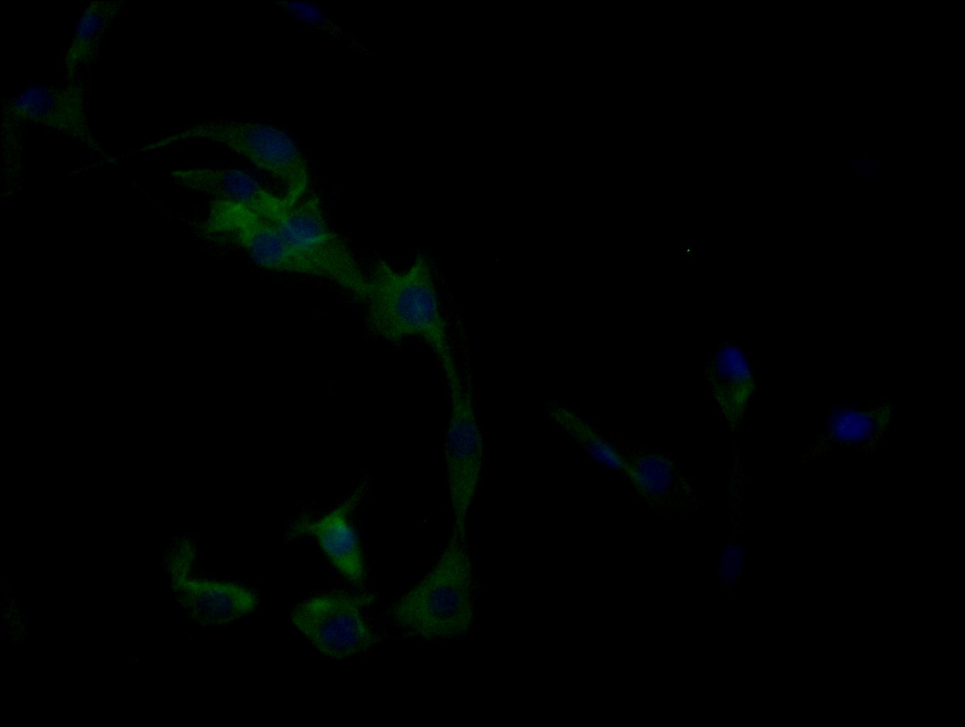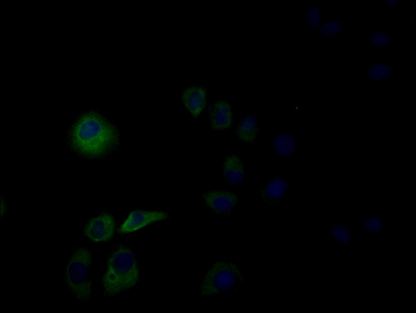 Immunofluorescence staining of MCF-7 cells with CSB-PA740922HA01HU at 1:50, counter-stained with DAPI. The cells were fixed in 4% formaldehyde, permeabilized using 0.2% Triton X-100 and blocked in 10% normal Goat Serum. The cells were then incubated with the antibody overnight at 4°C. The secondary antibody was Alexa Fluor 488-congugated AffiniPure Goat Anti-Rabbit IgG(H+L).
