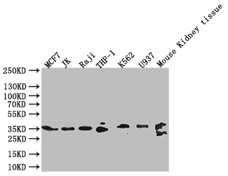 Positive WB detected in: MCF7 whole cell lysate, JK whole cell lysate, Raji whole cell lysate, THP-1 whole cell lysate, K562 whole cell lysate,U937 whole cell lysate,Mouse Kidney tissue lysate