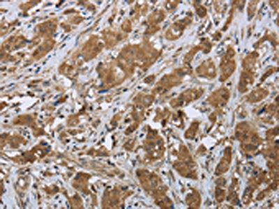 The image on the left is immunohistochemistry of paraffin-embedded Human breast cancer tissue using CSB-PA469305(CLPS Antibody) at dilution 1/45, on the right is treated with fusion protein. (Original magnification: ×200)