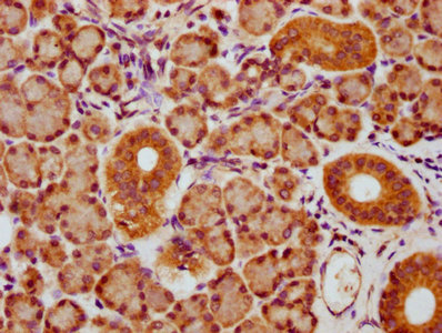 IHC image of CSB-PA815577LA01HU diluted at 1:600 and staining in paraffin-embedded human pancreatic tissue performed on a Leica BondTM system. After dewaxing and hydration, antigen retrieval was mediated by high pressure in a citrate buffer (pH 6.0). Section was blocked with 10% normal goat serum 30min at RT. Then primary antibody (1% BSA) was incubated at 4°C overnight. The primary is detected by a biotinylated secondary antibody and visualized using an HRP conjugated SP system.