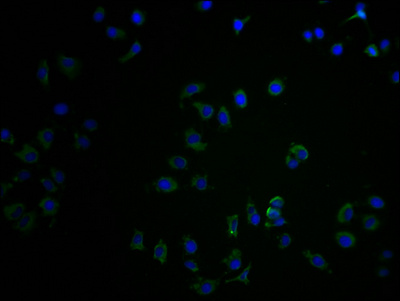 • Immunofluorescence staining of A549 cells with CSB-PA822273LA01HU at 1:100, counter-stained with DAPI. The cells were fixed in 4% formaldehyde and blocked in 10% normal Goat Serum. The cells were then incubated with the antibody overnight at 4°C. The secondary antibody was Alexa Fluor 488-congugated AffiniPure Goat Anti-Rabbit IgG(H+L).