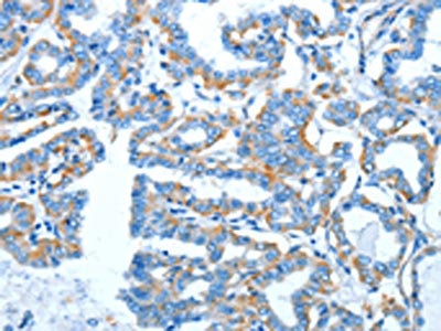 The image on the left is immunohistochemistry of paraffin-embedded Human thyroid cancer tissue using CSB-PA997514(COX7B2 Antibody) at dilution 1/20, on the right is treated with fusion protein. (Original magnification: ×200)