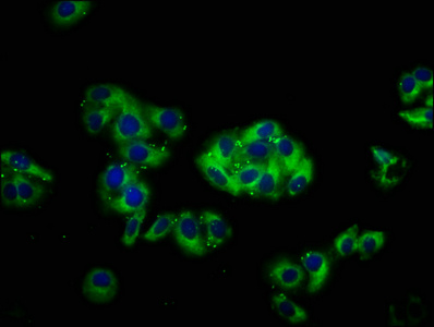 • Immunofluorescence staining of HepG2 cells with CSB-PA005902LA01HU at 1:66, counter-stained with DAPI. The cells were fixed in 4% formaldehyde, permeabilized using 0.2% Triton X-100 and blocked in 10% normal Goat Serum. The cells were then incubated with the antibody overnight at 4°C. The secondary antibody was Alexa Fluor 488-congugated AffiniPure Goat Anti-Rabbit IgG(H+L).