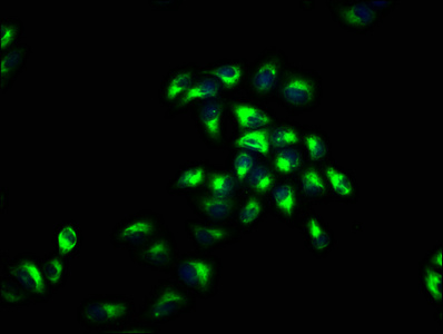 • Immunofluorescence staining of Hela cells with CSB-PA005934LA01HU at 1:66, counter-stained with DAPI. The cells were fixed in 4% formaldehyde, permeabilized using 0.2% Triton X-100 and blocked in 10% normal Goat Serum. The cells were then incubated with the antibody overnight at 4°C. The secondary antibody was Alexa Fluor 488-congugated AffiniPure Goat Anti-Rabbit IgG(H+L).
