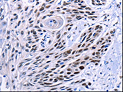 The image on the left is immunohistochemistry of paraffin-embedded Human esophagus cancer tissue using CSB-PA824713(CREBBP Antibody) at dilution 1/5, on the right is treated with synthetic peptide. (Original magnification: ×200)