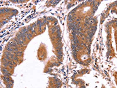 • The image on the left is immunohistochemistry of paraffin-embedded Human colon cancer tissue using CSB-PA795553(CRISP3 Antibody) at dilution 1/50, on the right is treated with fusion protein. (Original magnification: ×200)