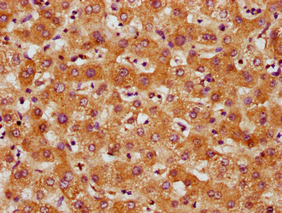 • IHC image of CSB-PA747623LA01HU diluted at 1:500 and staining in paraffin-embedded human liver tissue performed on a Leica BondTM system. After dewaxing and hydration, antigen retrieval was mediated by high pressure in a citrate buffer (pH 6.0). Section was blocked with 10% normal goat serum 30min at RT. Then primary antibody (1% BSA) was incubated at 4°C overnight. The primary is detected by a biotinylated secondary antibody and visualized using an HRP conjugated SP system.