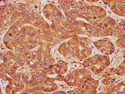 • IHC image of CSB-PA747623LA01HU diluted at 1:500 and staining in paraffin-embedded human liver cancer performed on a Leica BondTM system. After dewaxing and hydration, antigen retrieval was mediated by high pressure in a citrate buffer (pH 6.0). Section was blocked with 10% normal goat serum 30min at RT. Then primary antibody (1% BSA) was incubated at 4°C overnight. The primary is detected by a biotinylated secondary antibody and visualized using an HRP conjugated SP system.