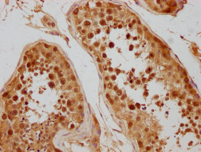 IHC image of CSB-PA006042LA01HU diluted at 1:300 and staining in paraffin-embedded human testis tissue performed on a Leica BondTM system. After dewaxing and hydration, antigen retrieval was mediated by high pressure in a citrate buffer (pH 6.0). Section was blocked with 10% normal goat serum 30min at RT. Then primary antibody (1% BSA) was incubated at 4°C overnight. The primary is detected by a biotinylated secondary antibody and visualized using an HRP conjugated SP system.