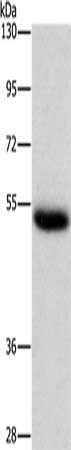 Gel: 6%SDS-PAGE, Lysate: 40 μg, Lane: Human placenta tissue, Primary antibody: CSB-PA358929(CTSC Antibody) at dilution 1/350, Secondary antibody: Goat anti rabbit IgG at 1/8000 dilution, Exposure time: 30 seconds