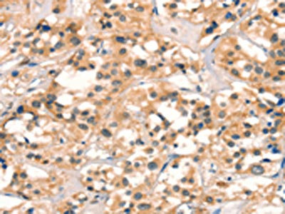 The image on the left is immunohistochemistry of paraffin-embedded Human thyroid cancer tissue using CSB-PA114714(CUEDC2 Antibody) at dilution 1/30, on the right is treated with fusion protein. (Original magnification: ×200)