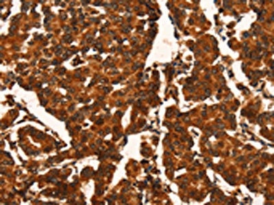 • The image on the left is immunohistochemistry of paraffin-embedded Human gastric cancer tissue using CSB-PA283839(CUEDC2 Antibody) at dilution 1/50, on the right is treated with fusion protein. (Original magnification: ×200)