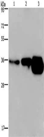 • Gel: 8%SDS-PAGE, Lysate: 40 μg, Lane 1-3: Human breast infiltrative duct tissue, Human fetal brain tissue, mouse brain tissue, Primary antibody: CSB-PA283839(CUEDC2 Antibody) at dilution 1/600, Secondary antibody: Goat anti rabbit IgG at 1/8000 dilution, Exposure time: 2 minutes