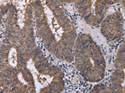 • The image on the left is immunohistochemistry of paraffin-embedded Human colon cancer tissue using CSB-PA595985(CUL3 Antibody) at dilution 1/30, on the right is treated with fusion protein. (Original magnification: ×200)