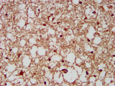 • IHC image of CSB-PA614451LA01HU diluted at 1:200 and staining in paraffin-embedded human brain tissue performed on a Leica BondTM system. After dewaxing and hydration, antigen retrieval was mediated by high pressure in a citrate buffer (pH 6.0). Section was blocked with 10% normal goat serum 30min at RT. Then primary antibody (1% BSA) was incubated at 4°C overnight. The primary is detected by a biotinylated secondary antibody and visualized using an HRP conjugated SP system.