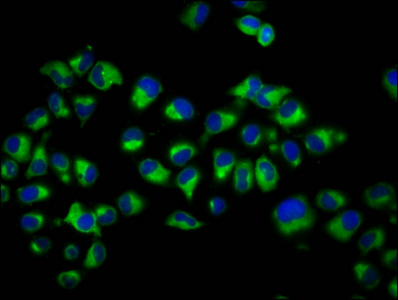 Immunofluorescence staining of Hela cells with CSB-PA006326LA01HU at 1:200, counter-stained with DAPI. The cells were fixed in 4% formaldehyde, permeabilized using 0.2% Triton X-100 and blocked in 10% normal Goat Serum. The cells were then incubated with the antibody overnight at 4°C. The secondary antibody was Alexa Fluor 488-congugated AffiniPure Goat Anti-Rabbit IgG(H+L).