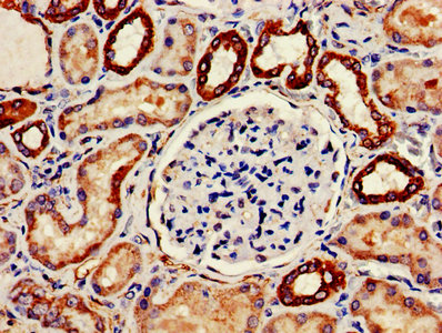 IHC image of CSB-PA006328EA01HU diluted at 1:200 and staining in paraffin-embedded human kidney tissue performed on a Leica BondTM system. After dewaxing and hydration, antigen retrieval was mediated by high pressure in a citrate buffer (pH 6.0). Section was blocked with 10% normal goat serum 30min at RT. Then primary antibody (1% BSA) was incubated at 4°C overnight. The primary is detected by a biotinylated secondary antibody and visualized using an HRP conjugated SP system.